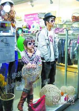 A shop dedicated to clothes and trappings in Xiamen, southeastern China's Fujian province, is using real-life models in its displays during the National Day holidays from October 1 to 8 in a bid to attract more consumers.