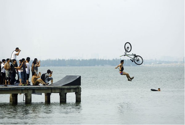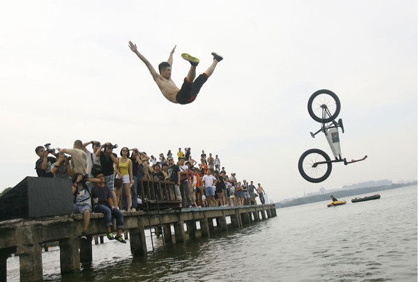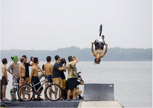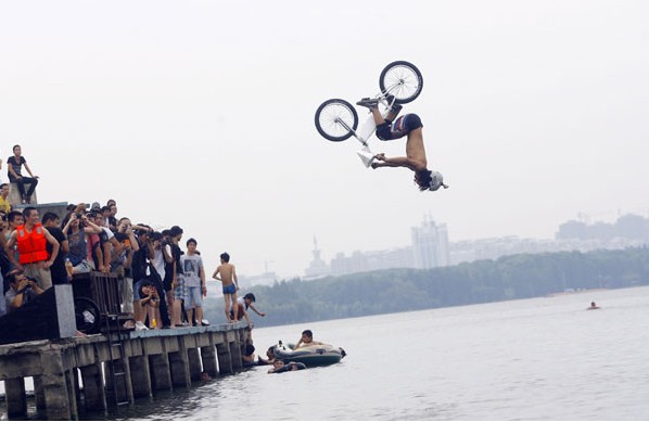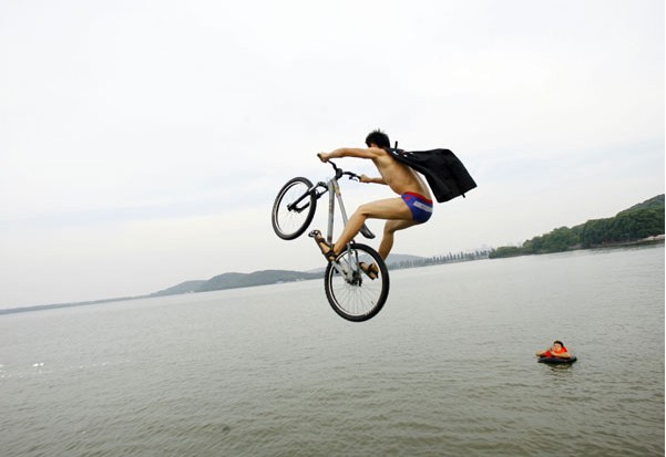 A cyclist jumps into a lake in Wuhan, capital of Central China’s Hubei province, July 9, 2012. The activity was organized on the Internet by extreme sports lovers in Wuhan.