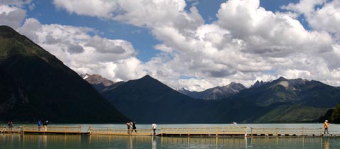 In Tibetan language, Baksum means 'green water'. The water is green because it is so pure and clean that the surrounding green trees are reflected in the lake surface. The water is so crystal-clear that fish can be seen even deep below the surface. Sand gulls and white cranes leisurely fly over the lake surface. Around the lake, there are both snow-capped mountains and mountains dotted with evergreen trees. In spring, vigorously blooming flowers are mirrored in the lake surface, forming a splendid picture. When autumn comes, flaming maples leaves light the whole mountain and reflect on the water, making it a sea of red color.