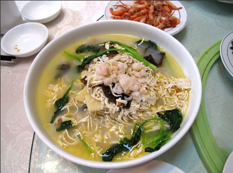 The breakfast is best rounded off with a tasty bowl of "spring noodles", cooked in chicken broth, with side dishes of spinach and black fungus.