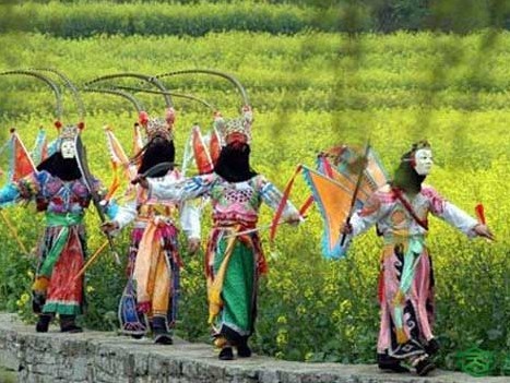 The street opera are mainly Catch the Yellow Spirit and other flower fairs. Catch the Yellow Spirit is the important one. There are almost one thousand persons, among whom there are 30 persons with masks and four hundred persons were face-painted take part in it. So it almost for every family and every person to perform. Why Catch the Yellow Spirit is called exorcising opera not exorcising dance is just because it has the plot. By means of catching the spirit, trying the spirit, sentencing the spirit and executing the spirit, people are taught to obey the law and take care of the parents.